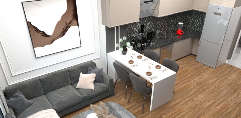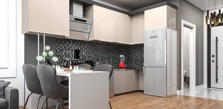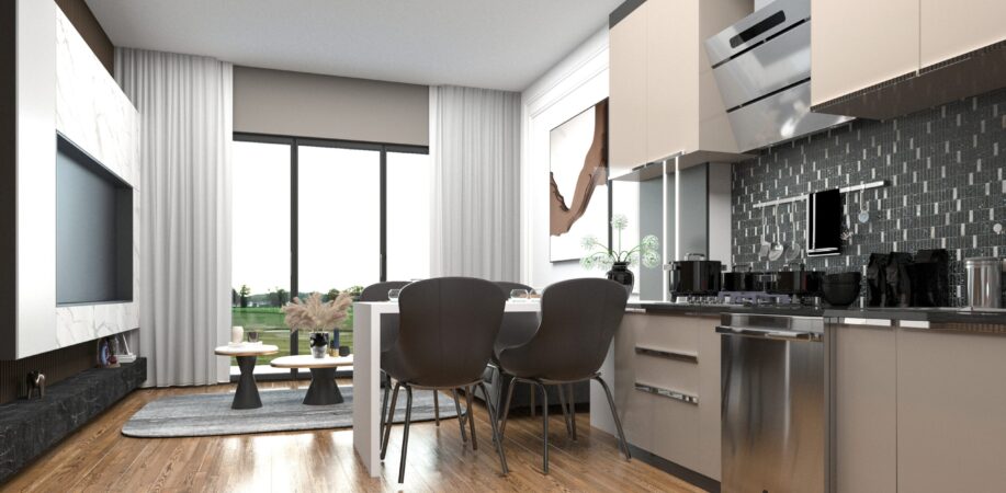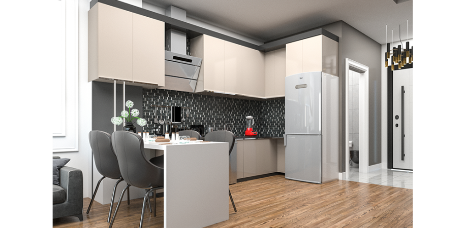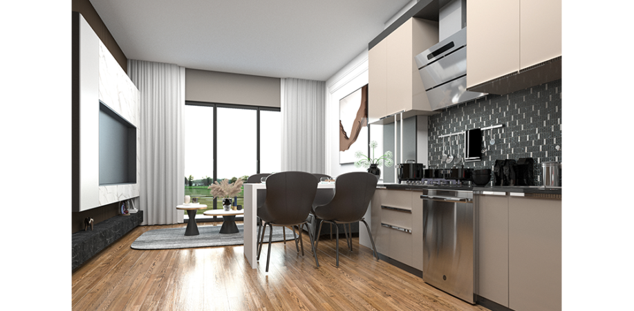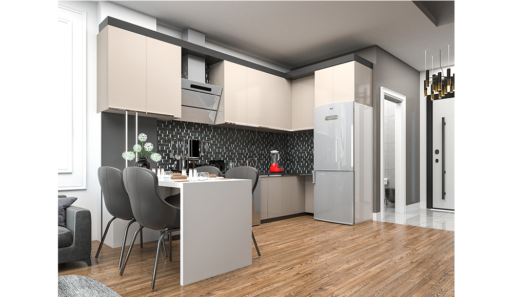 Mutfaklar: Salonda Amerikan mutfak en konforlu kullanıma yönelik olarak dizayn edilmiştir. Yemek masası da mutfakla beraber kullanılabilmektedir. Kombi dolabı mutfak dolapları arasında yer kaybına sebep olmayacak şekildedir. Mutfaklar laminat tezgah, üstleri yanmaz, çizilmez rezopal malzemedir.Evye ve armatürler TSE belgelidir.