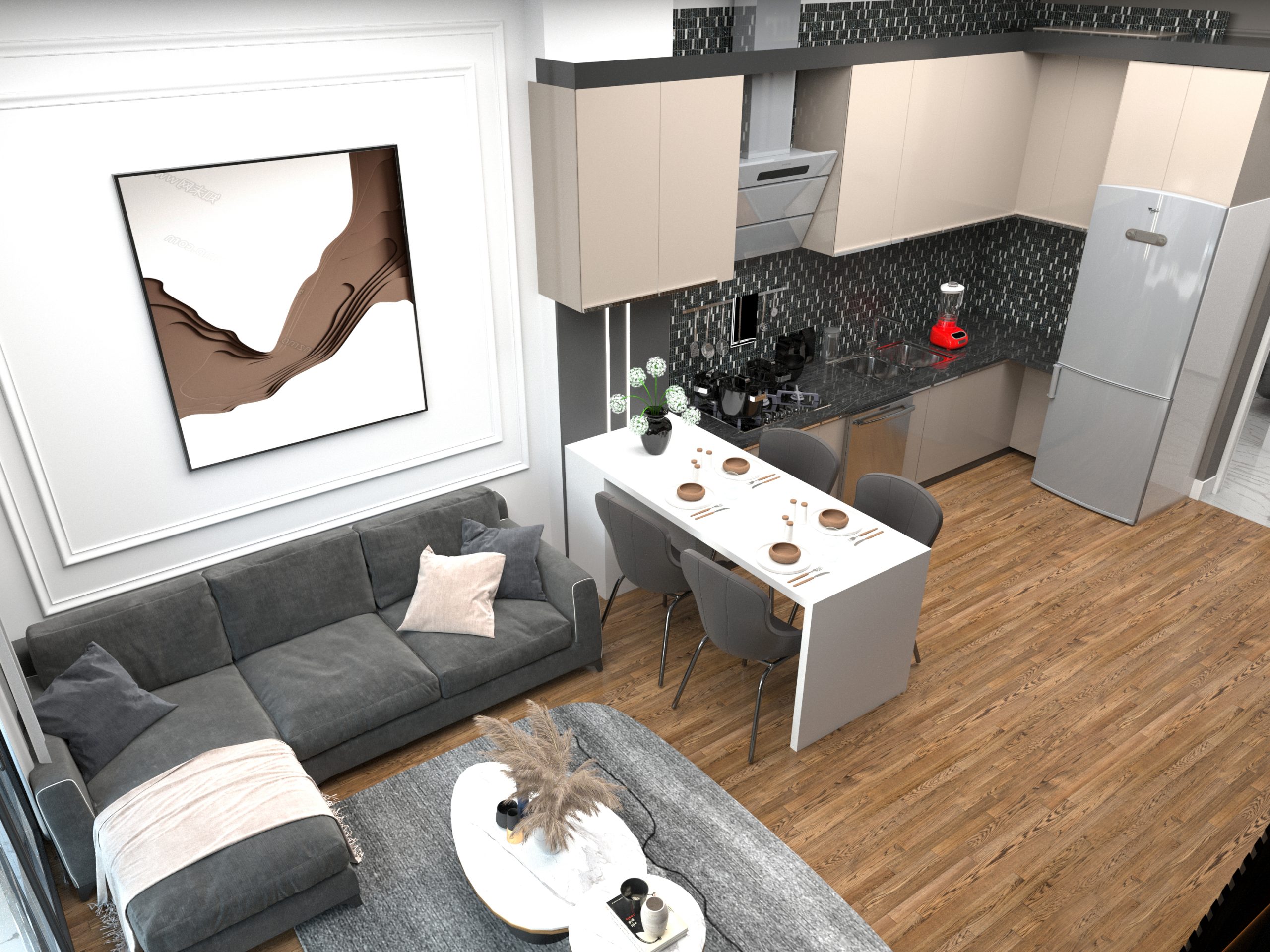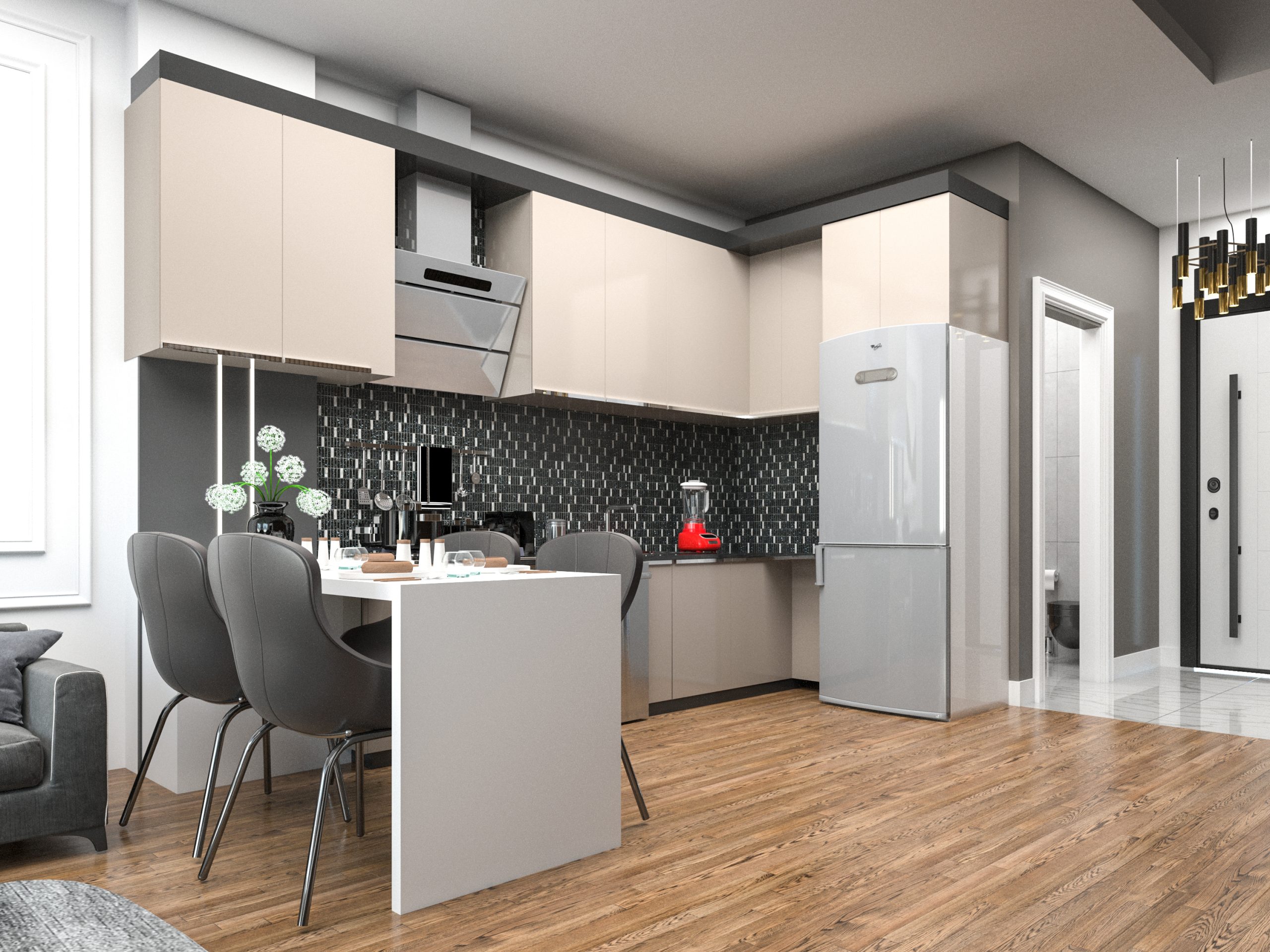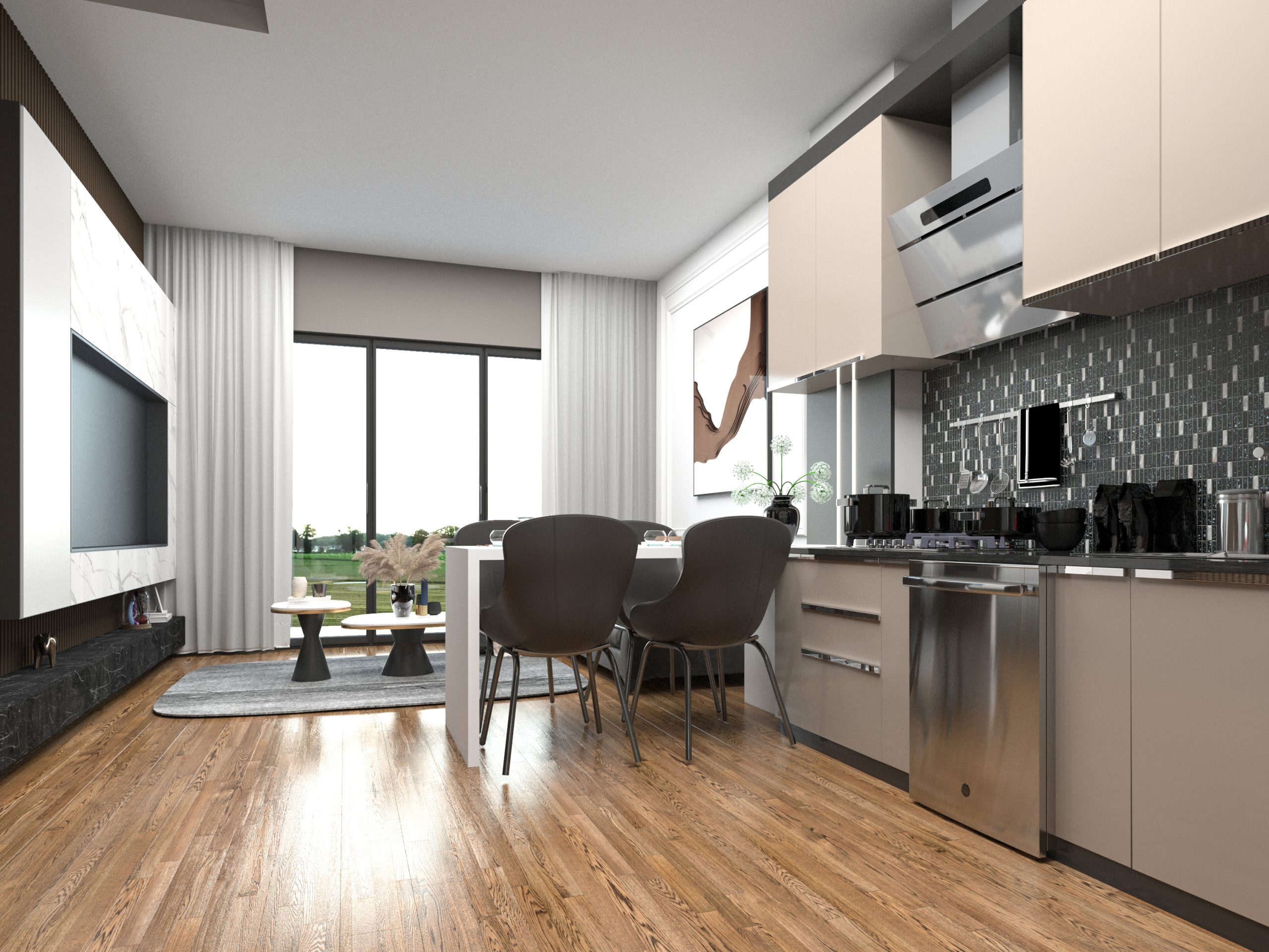 Mutfaklar: Salonda Amerikan mutfak en konforlu kullanıma yönelik olarak dizayn edilmiştir. Yemek masası da mutfakla beraber kullanılabilmektedir. Kombi dolabı mutfak dolapları arasında yer kaybına sebep olmayacak şekildedir. Mutfaklar laminat tezgah, üstleri yanmaz, çizilmez rezopal malzemedir.Evye ve armatürler TSE belgelidir.